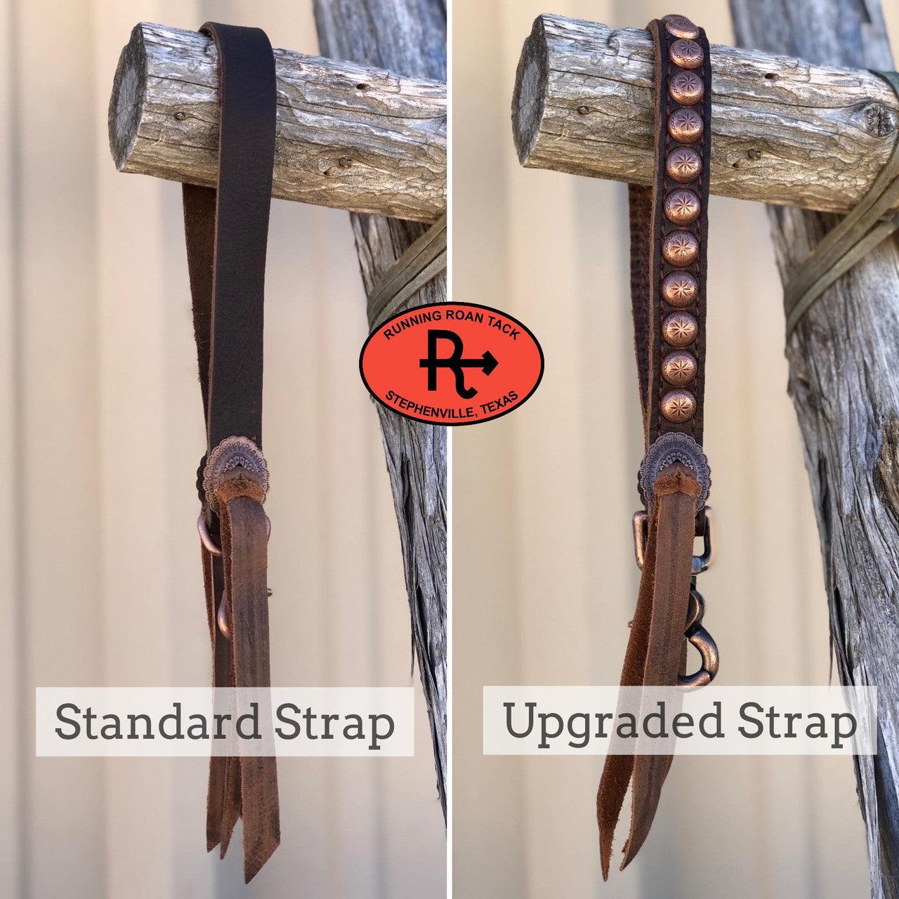 "The Pecos" comes with your choices of wristlet strap styles: standard or upgraded. The standard strap is durable, single ply bull hide with a trigger snap, two slotted conchos (one on each side) and leather ties. The upgraded strap is doubled and stitched bull hide with large dots, trigger snap, two slotted conchos (one on each side) and leather ties.