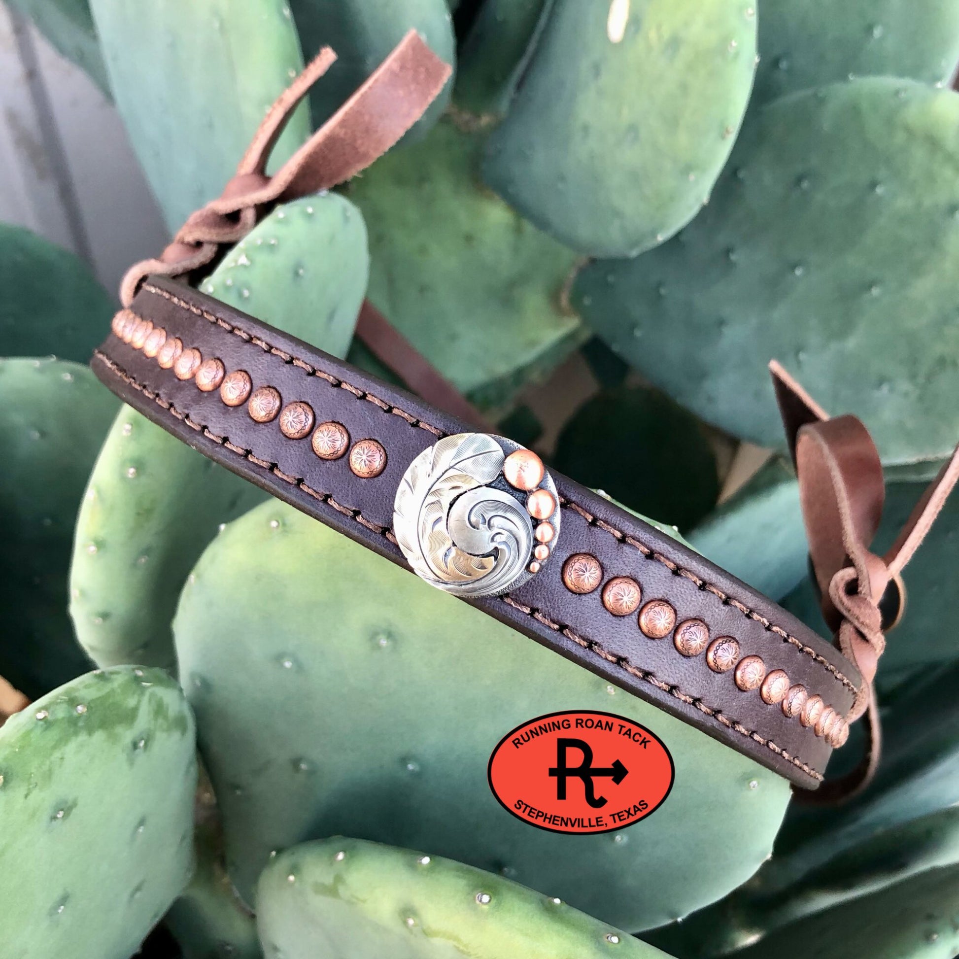 Handmade by Running Roan Tack in Stephenville, TX! Tiedown noseband for barrel racing, roping, etc. Features German silver feather concho and copper dots. The noseband is made from our signature dark chocolate bridle leather. Hanger is made from brown latigo and tied to the noseband with bleed knots. Solid brass loop for strap attachment. TIEDOWN STRAP SOLD SEPARATELY.