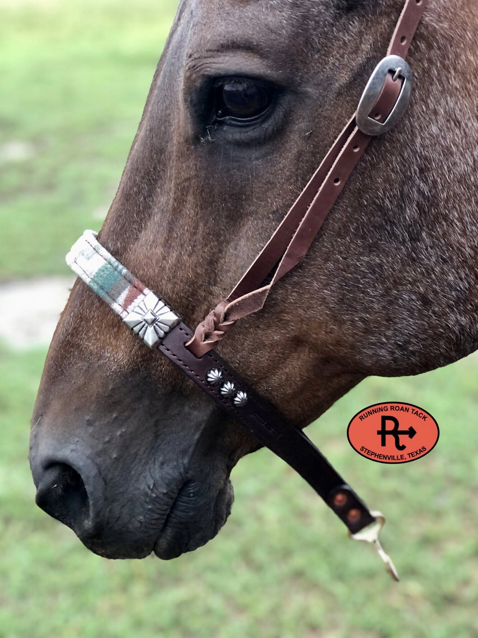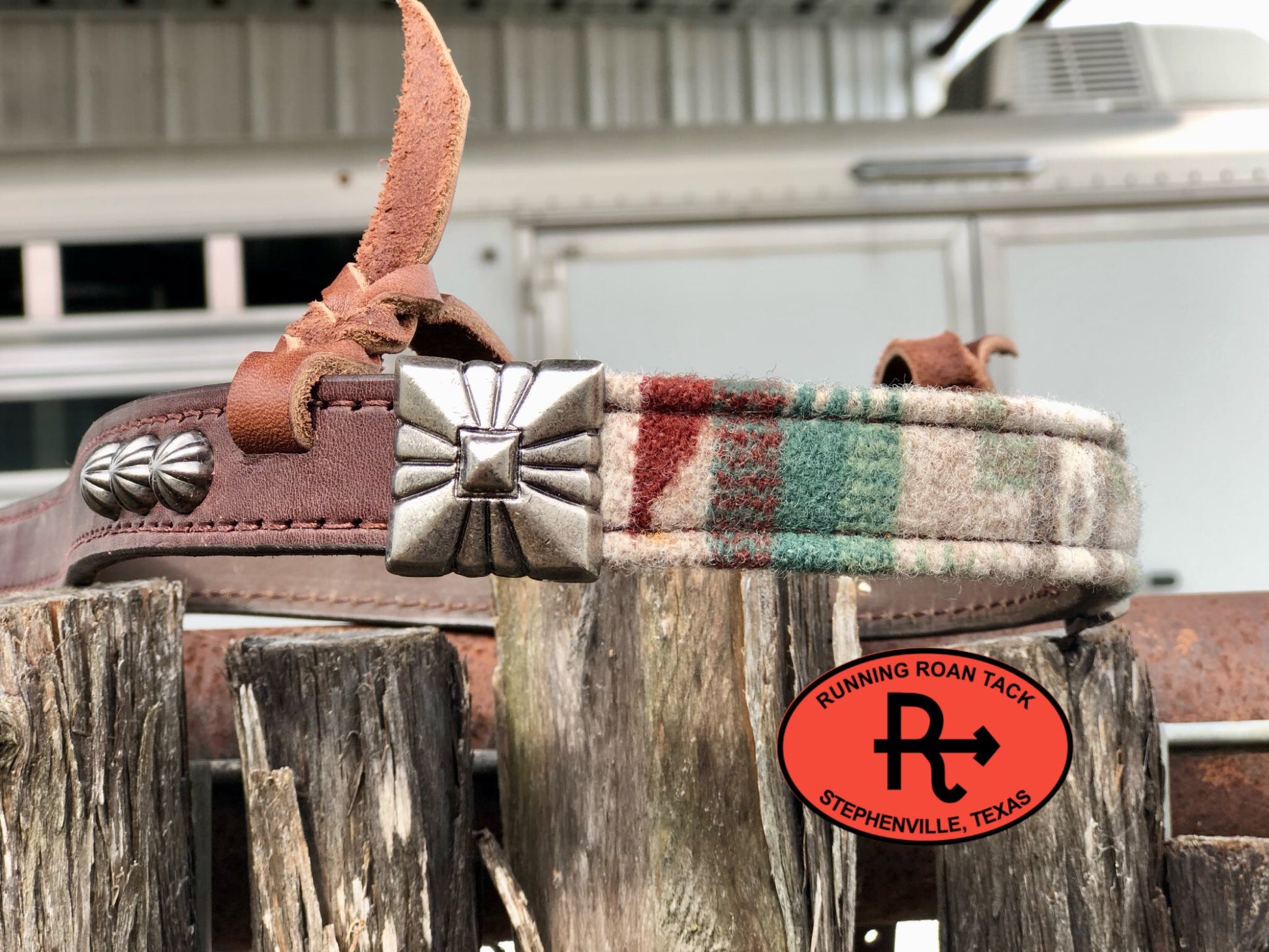 Handmade by Running Roan Tack in Stephenville, TX! Tiedown noseband for barrel racing, roping, etc. Features overlaid genuine Pendleton® wool. Antique silver conchos. The noseband is made from our signature dark chocolate bridle leather. Hanger is made from brown latigo and tied to the noseband with bleed knots. Antique silver dots on the noseband and matching buckle on the hanger. Solid brass loop for strap attachment. TIEDOWN STRAP SOLD SEPARATELY.