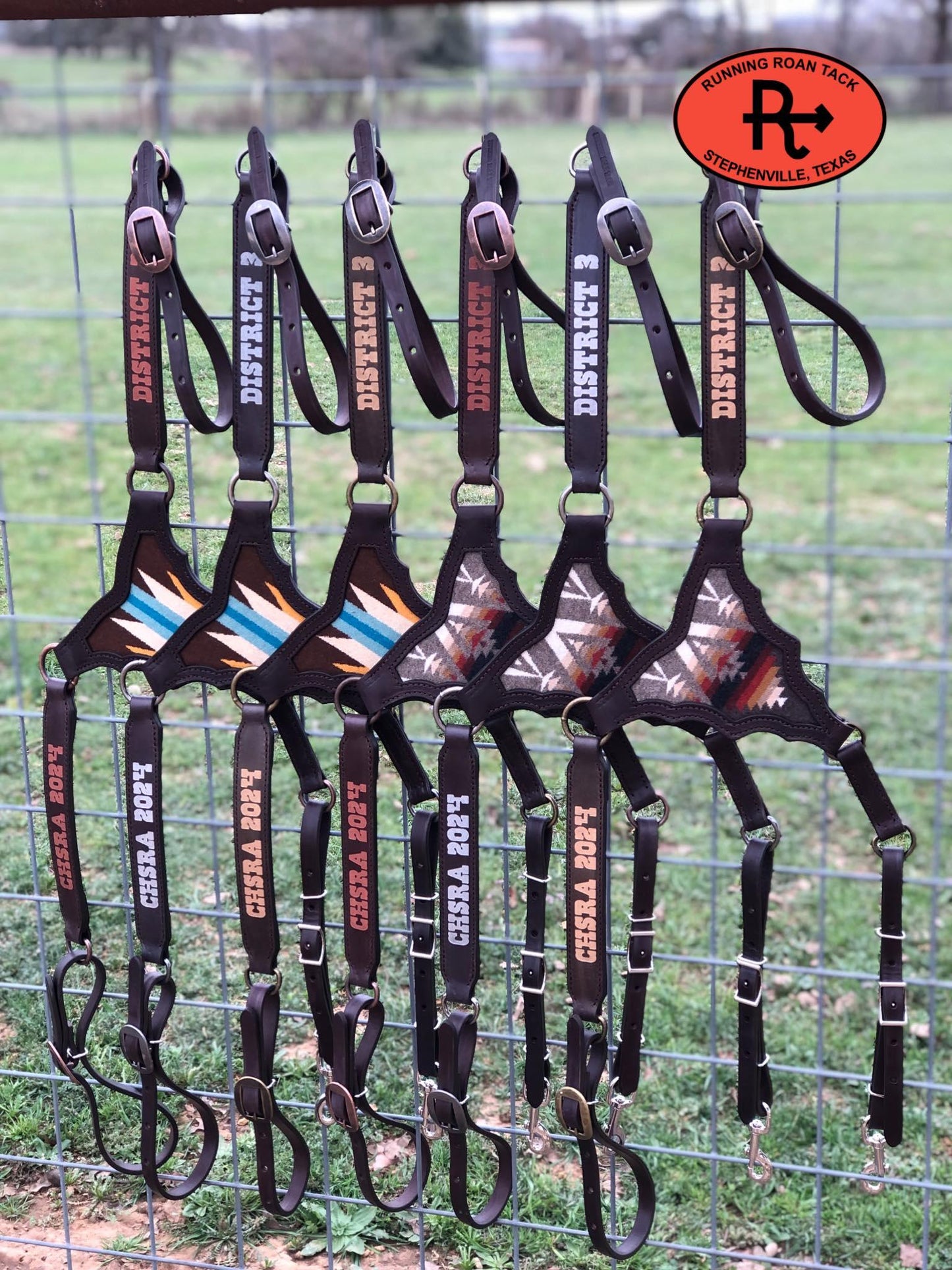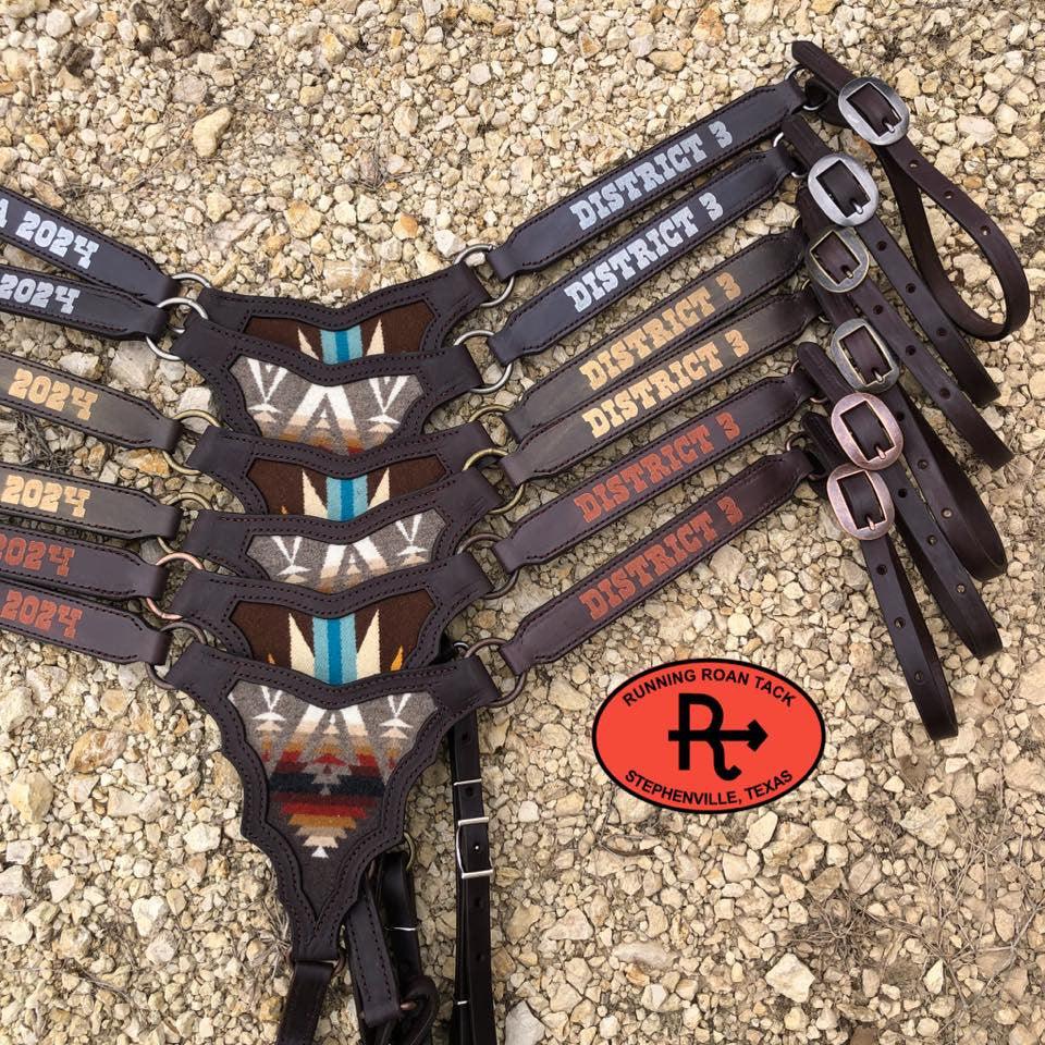 Palomo breast collar with trophy award lettering. Price includes plain buckles (shown in example photos) and lasered lettering which can be colorized in the color of your choice. No quantity discounts.