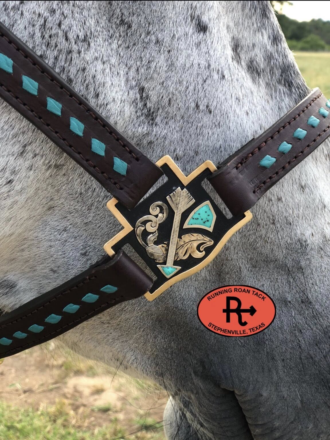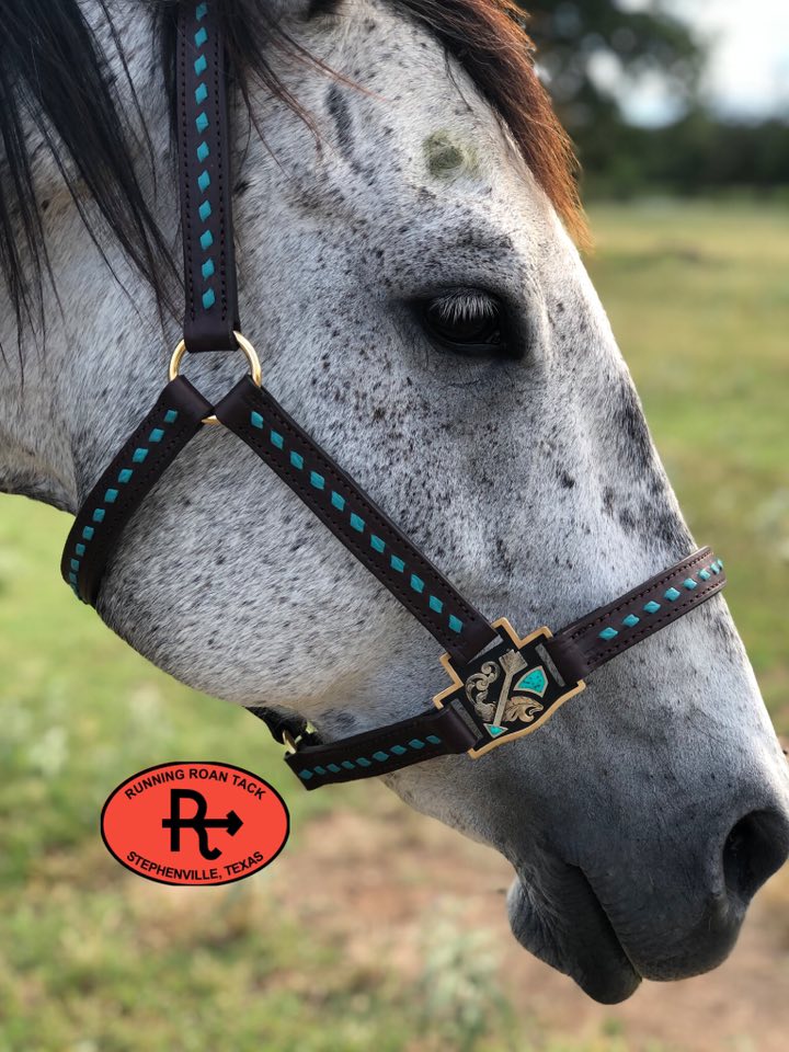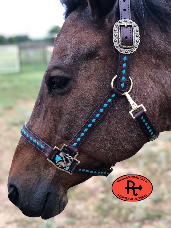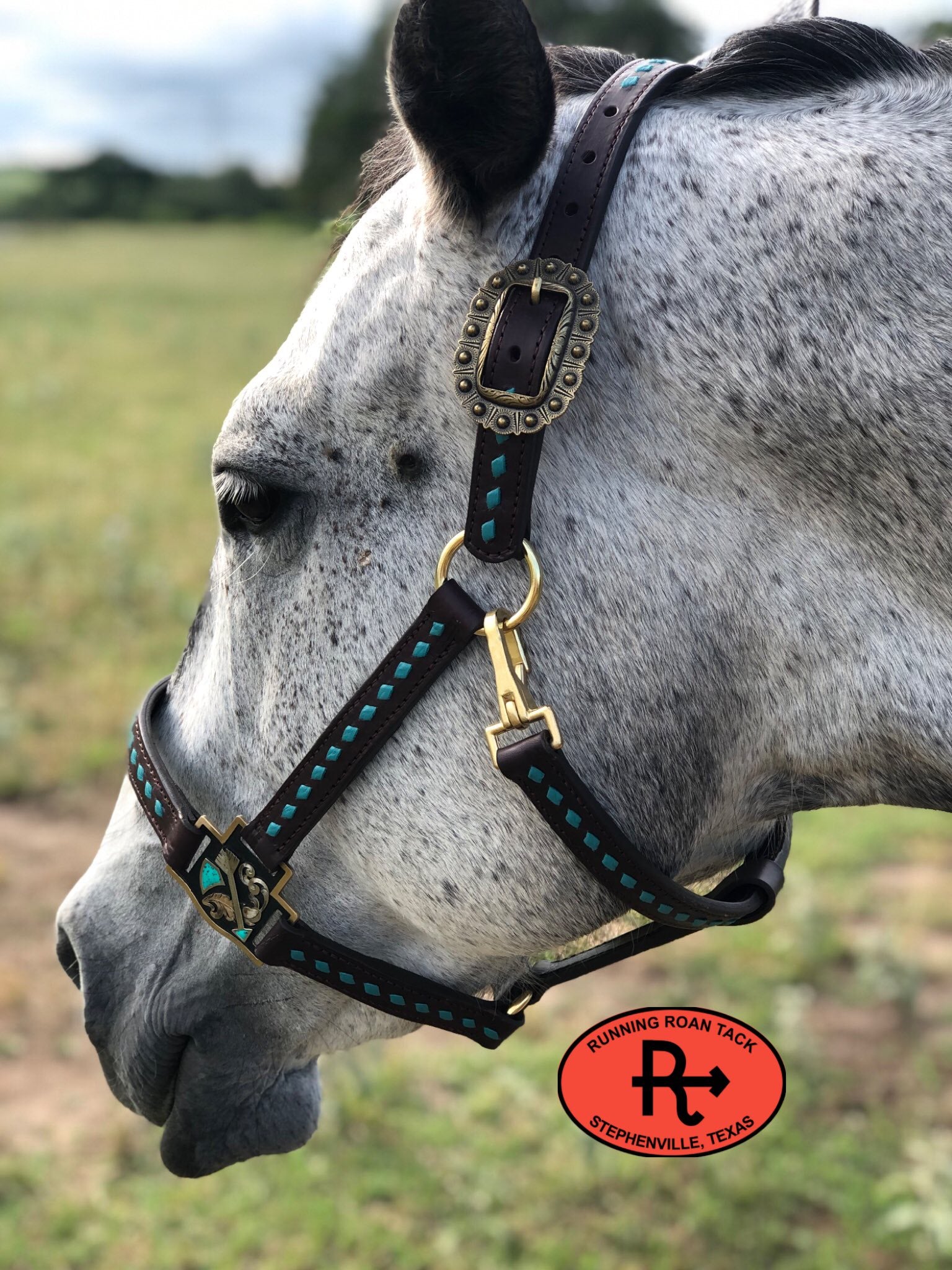 A beautiful, all leather halter made by Running Roan Tack. This halter is average horse size. Made from durable bridle leather. Turquoise buckstitch. Solid brass rings and clip at throat. Halter squares are german silver with an arrow motif.