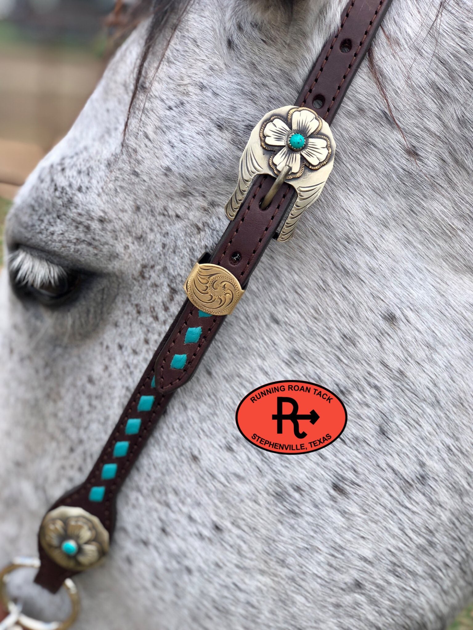 A beautiful headstall handcrafted by Running Roan Tack. This headstall adjusts from 37"-41" overall length.