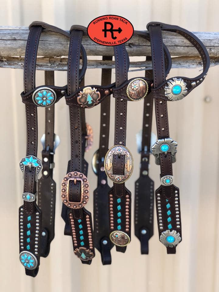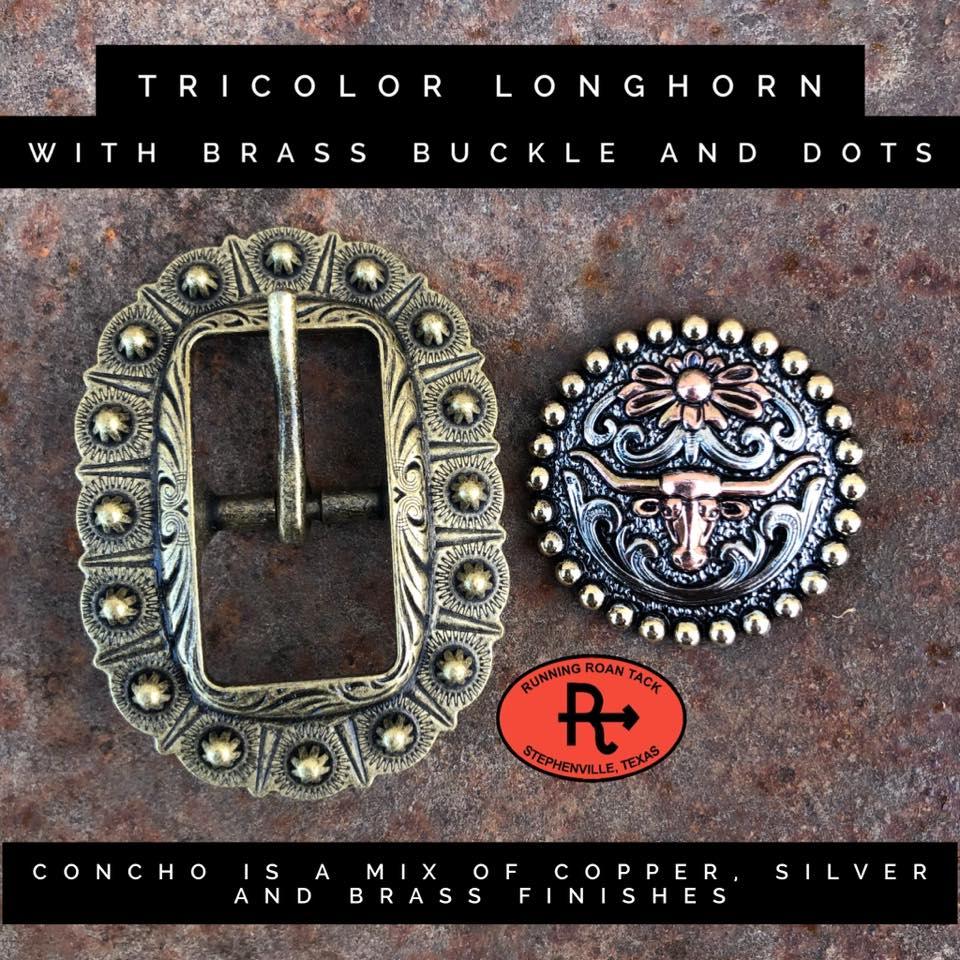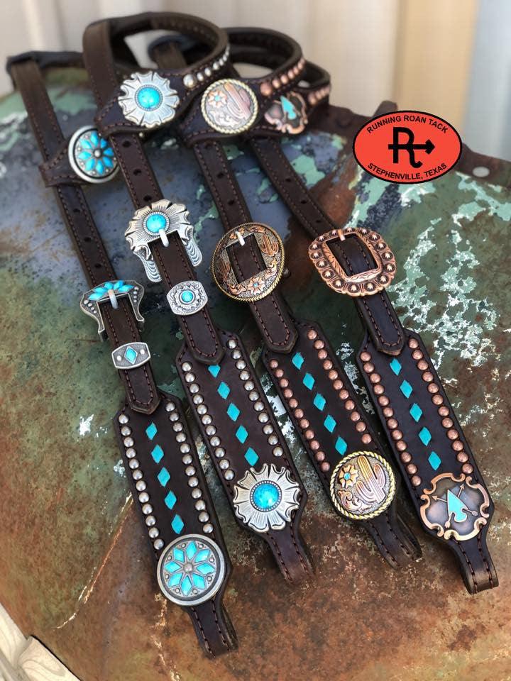 HARDWARE OPTIONS: Choose the conchos and buckles you'd like from the list above. You can conveniently view photos of all of the conchos/buckles on this page of our website: https://runningroantack.com/pages/buckles-conchos (opens in new tab/window)