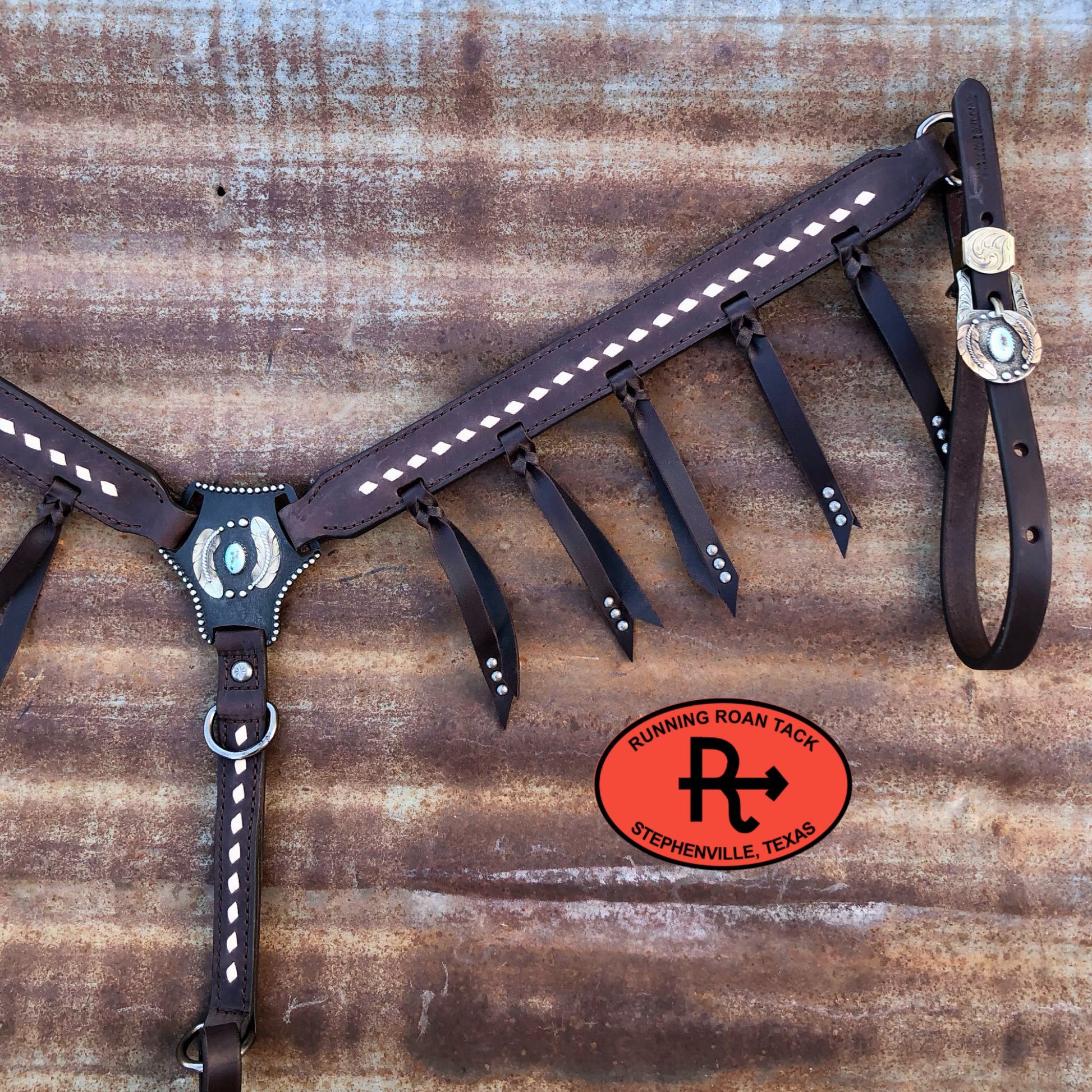 Punchy breast collar with white buckstitch with tied fringe. This breast collar is securely sewn, the conchos are decorative only. Simple straight lines and a maximum width of 1-1/2" makes this breast collar versatile and complimentary to any horse. The buckles are riveted to the tugs for safety. Adjustable cinch tug. This breast collar is made with our signature dark chocolate bridle leather and is lined with durable, sweat resistant burgundy latigo leather. Handmade from scratch in our workshop in rural Stephenville, TX.