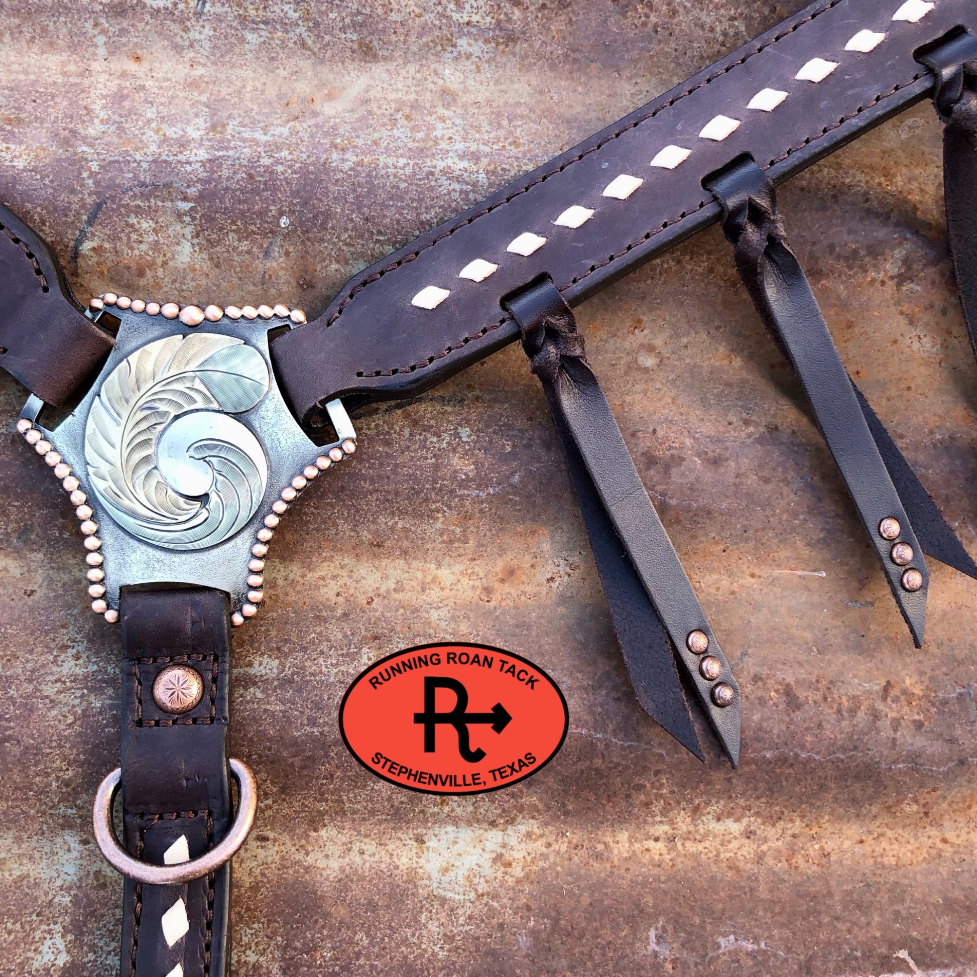 Punchy breast collar with white buckstitch with tied fringe. This breast collar is securely sewn, the conchos are decorative only. Simple straight lines and a maximum width of 1-1/2" makes this breast collar versatile and complimentary to any horse. The buckles are riveted to the tugs for safety. Adjustable cinch tug. This breast collar is made with our signature dark chocolate bridle leather and is lined with durable, sweat resistant burgundy latigo leather. Handmade from scratch in our workshop in rural Stephenville, TX.