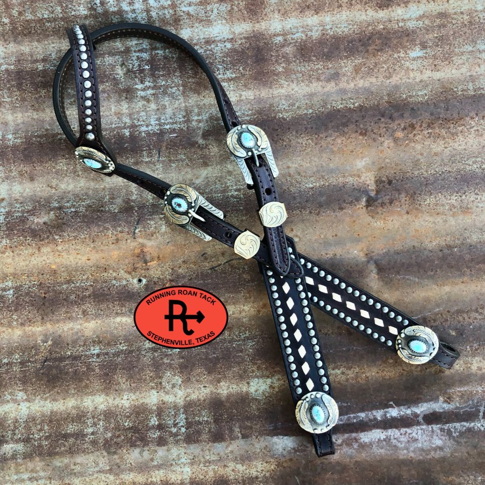 A beautiful headstall handcrafted by Running Roan Tack. German silver hardware. White (natural) big, bold buckstitch on the cheeks. This headstall adjusts from 36"-43" overall length.
